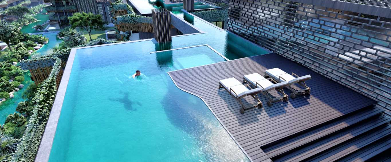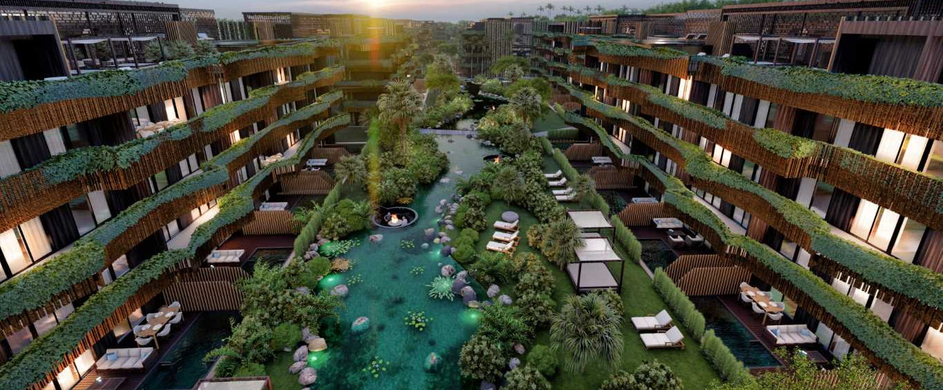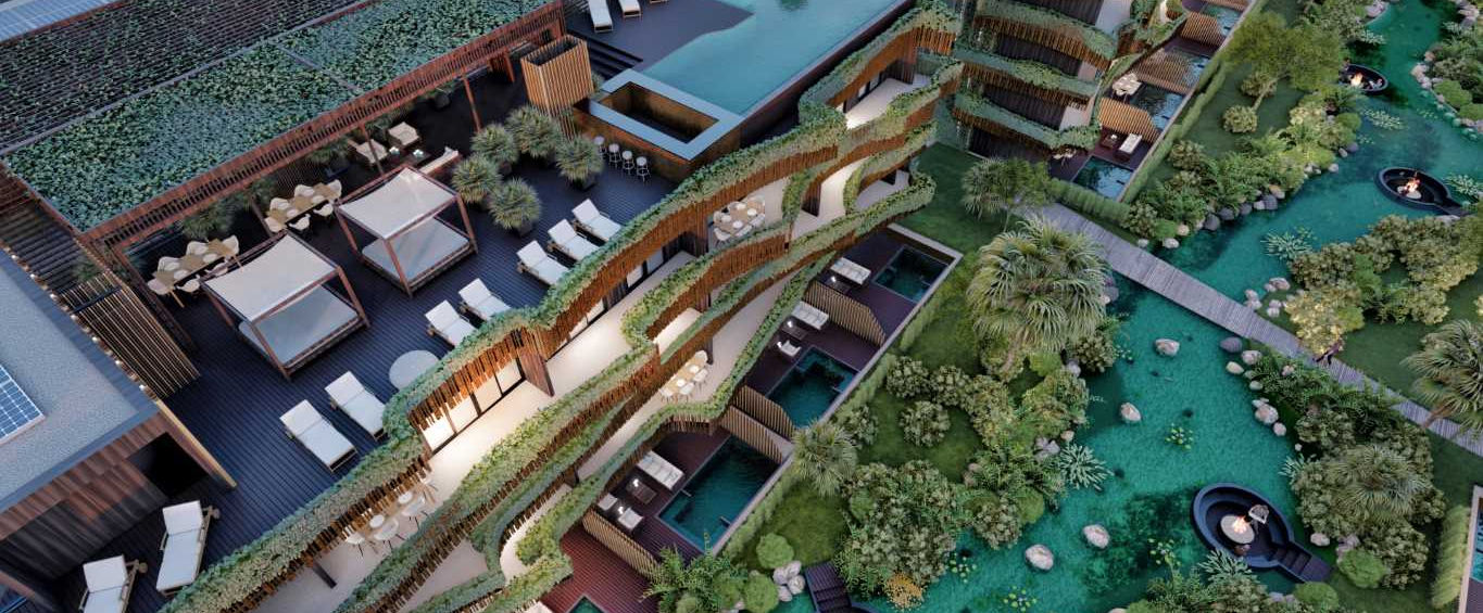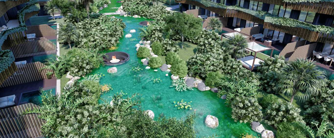 Luxury community spaces are integrated into nature, so the complex offers jungle gardens, community pools with connected channels, magical outdoor spaces, hammock areas integrated into the river, multiple use pavilions and sports equipment, as well as swimming pools, interconnected rooftops, gym / yoga, deck areas, and outdoor parking.